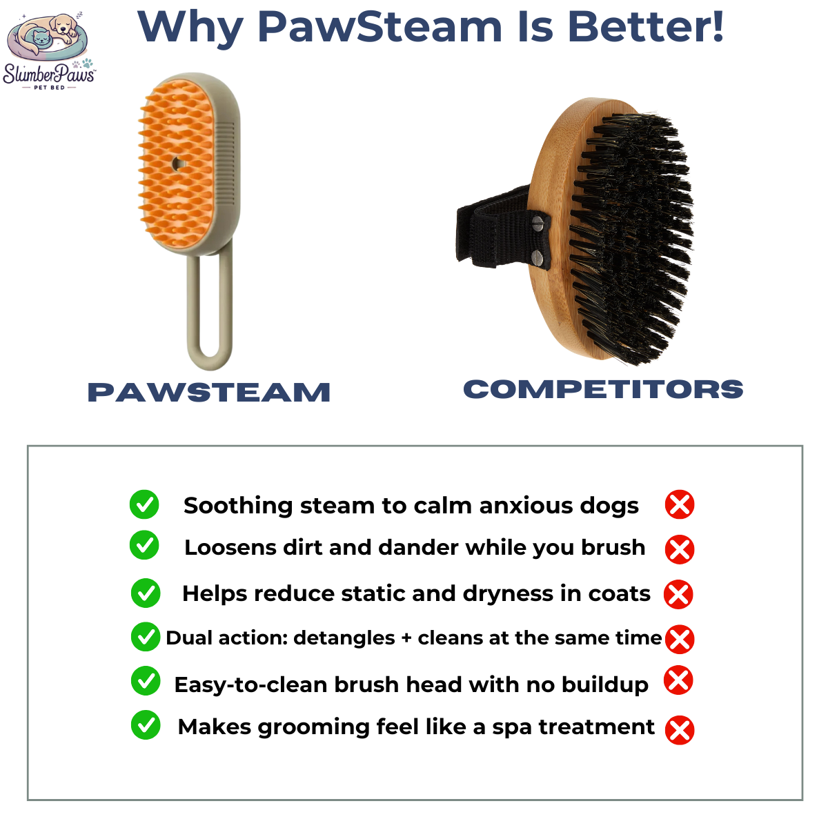 We know the struggle — your dog runs from the brush, the fur flies everywhere, and everyone ends up stressed. That’s why we made PawSteam. With soothing mist and gentle bristles, it’s a kinder way to groom that your dog actually looks forward to.